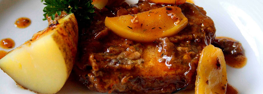 4. Verter la Salsa de Manzanas, en el refractario, encima de las chuletas. Adornar con gajos de manzana y hornear a 180ºC durante 20 minutos.